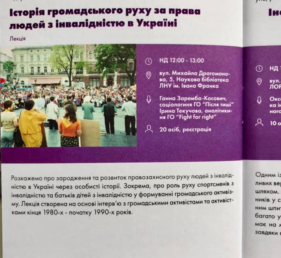 Цього року і ми раді долучитися до Днів європейської спадщини, де аналітикиня Fight For Right Ірина Текучова разом з соціологинею ГО “Після тиші” Ганною Зарембою проведе лекцію та розкаже про зародження і розвиток правозахисного руху людей з інвалідністю в Україні. Зокрема про роль руху спортсменів з інвалідністю та батьків дітей з інвалідністю у формуванні громадського активізму. Захід відбудеться у неділю, 12 вересня о 12:00 у Науковій бібліотеці ЛНУ ім. Івана Франка, вул. Михайла Драгоманова, 5.