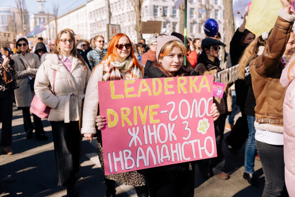 Anzhelika, a participant in the March and the LEADERKA DRIVE movement, symbolically carried the Fight For Right flag at the head of the column, wearing the emblem of the “Maisternia Mrii” organization. Just a few years ago, she lived in a residential care facility. It was the work of human rights organizations and grassroots initiatives focused on independent living that gave her, and other women with disabilities, the chance to leave the walls of a resedential institution.