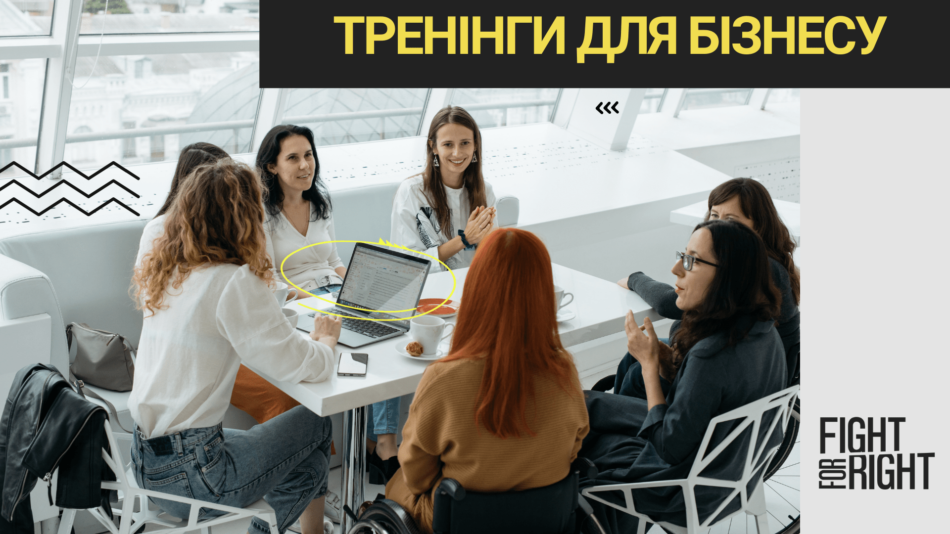 ГО Fight For Right проводить тренінги для бізнесу, який хоче розвиватись у напрямку інклюзивності та прав людини. Ми проводимо корпоративні тренінги онлайн та офлайн для власників бізнесів, HRів та інгих співробітників на теми: “Люди з інвалідністю на ринку праці”, “Запровадження політик інклюзивності у компанії”, “Працевлаштування людей з інвалідністю”, “Доступнсть робочого процесу та робочого середовища”.