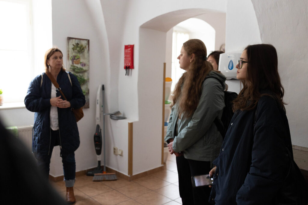 Наприкінця дня нашим адвокаційницям вдалося дізнатися про процес трансформації діючої інституції зсередини на прикладі закладу для людей з психічними порушеннями внаслідок тривалого вживання алкоголю та алкогольною деменцією зокрема в Пржно. Пржно послуги все ще надаються на базі інституції, однак, відбуваються поступові зміни у підходах, ставленні до клієнтів, а також житлових умовах. Кінцевою метою цих змін є повна відмова від інституційного підходу на користь надання послуг підтримки та реабілітації в громаді. Директор центру надання соціальних послуг Карел Матоха розповів детальніше про те, як він за своєю командою поступово гуманізують підходи у спеціальному будинку в Пржно, працюють над відновленням контактів своїх клієнтів із соціальним середовищем, а також підтримують та розвивають навички ведення побуту та самостійного життя. Хоча у порівнянні з раніше цілковито ізольованим режимом та концентрацією закладу на надання клієнтам виключно “ліжкомісця” такі зміни є вагомими, Карел Матоха зізнається, що в закладі зберігаються невідʼємні риси та характеристики інституції, а саме спільний обідній простір, спільні коридори як місця дозвілля, спільні санвузли на поверсі та коридори між відділеннями та крилами будівлі, що позбавляють людину потреби виходити на вулицю. Саме тому ліквідація цього закладу є неминучою і саме це залишається кінцевою метою та пріоритетом усіх змін в Пржно.