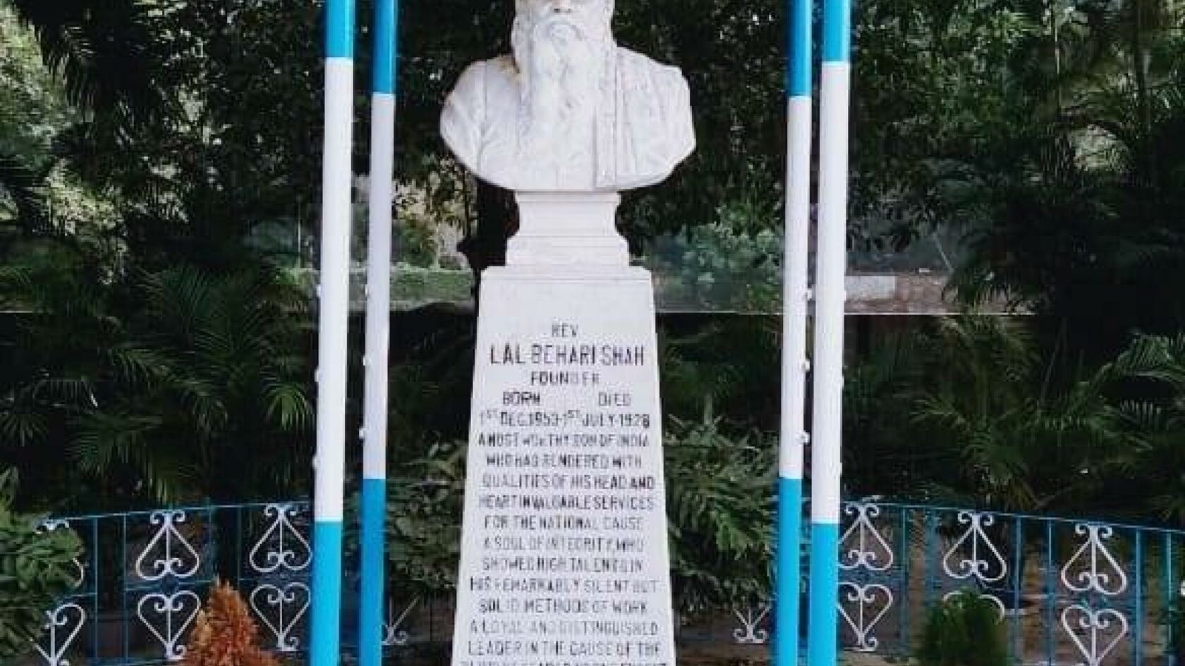 Пам’ятник преп. Лал Біхарі Шахові на території Калькуттської школи сліпих з написом: “REV LAL BEHARI SHAH / Founder / Born 1st dec 1853 died 1st july 1928 / A most worthy son of India / who had rendered with / qualities of his head and / heart invaluable services / for the national cause. / A soul of integrity who / showed high talents in / his remarkably silent but / solid methods of work / a loyal and distinguished / leader in the cause of the / blind he feared no one except / God and ventured on faith. In memory of this great departed / soul we bow in reverence / Erected / by / Principal Amal Shah / & his friends / of the / National Association / for the Blind”, фото 2011 року.