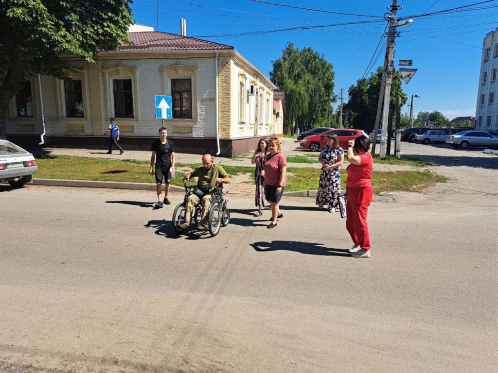 Світлана разом з активістами/ками тестували новий простір на архітектурну доступність у Гадячі