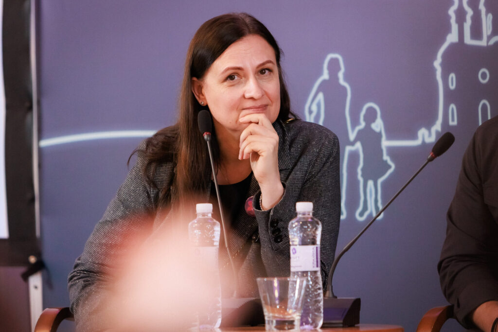 Іванна Михайленко, голова ГО Світ тиші, ставить запитання спікерам та спікеркам