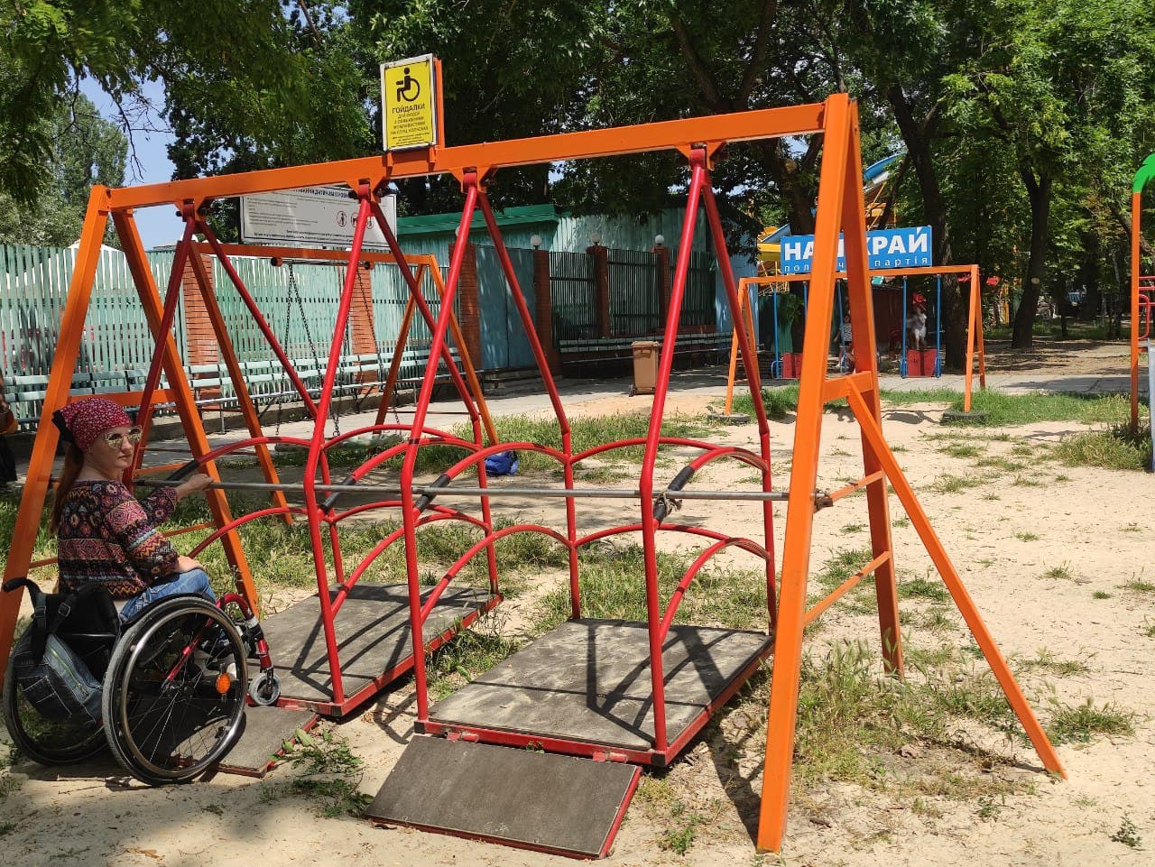 - Особливо неприємно справляє враження наявність на дитячому майданчику гойдалки для дітей на кріслах колісних, яка… зачинена на ключ. Є табличка – звертатися в адміністрацію, а де шукати цю адміністрацію не зазначено. Тим більше батькам, які просто вийшли з дитиною гуляти, навіщо щось спеціально шукати, чому не організувати доступний простір за замовчуванням?