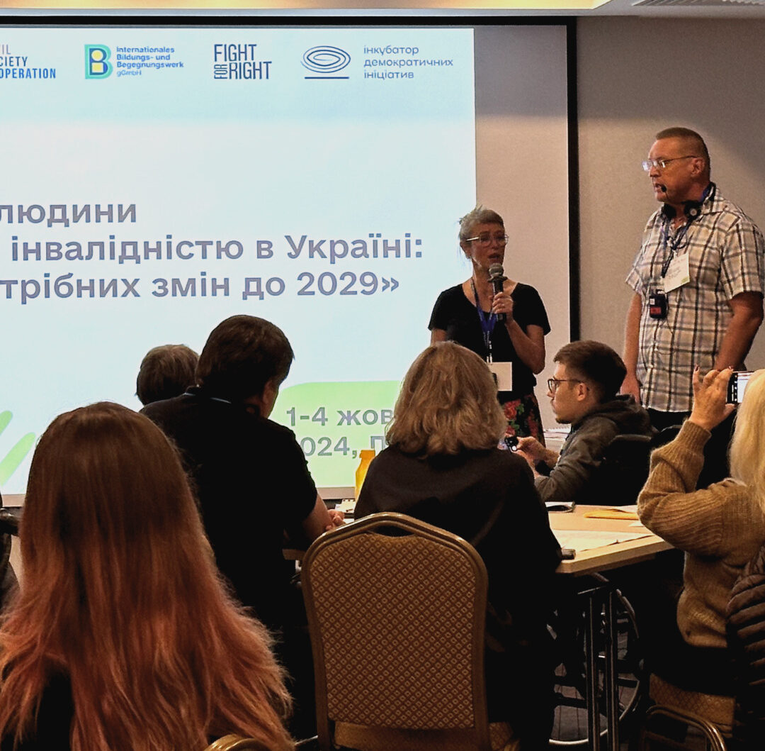 Потрібно об’єднувати зусилля для просування змін у дотриманні прав людей з інвалідністю. На цій думці зійшлися учасники та учасниці Форуму «Права людини людей з інвалідністю в Україні: мапа потрібних змін до 2029», організованого Fight For Right спільно з Internationales Bildungs- und Begegnungswerk in Dortmund (Німеччина) та ГО «Інкубатор демократичних ініціатив».