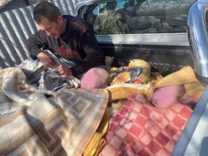 Евакуація з прифронтових районів складна. «Хто тільки не вивозив, і військові нам вивозять, і волонтери вивозять, і поліція вивозить. І, якщо ви подивитесь на моїй сторінці в фейсбук, я просто в багажнику вивожу, на матрасах. По всякому буває», – каже Євген й продовжує: