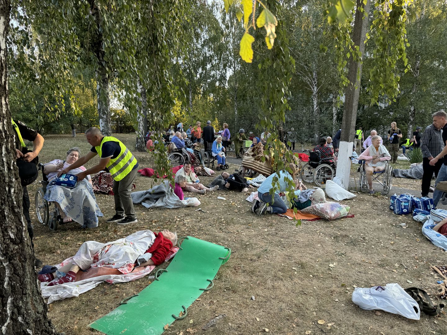 Фото – Суспільне Суми. Геріатричний пансіонат після обстрілу та частина мешканців і мешканок, евакуйованих із приміщення.